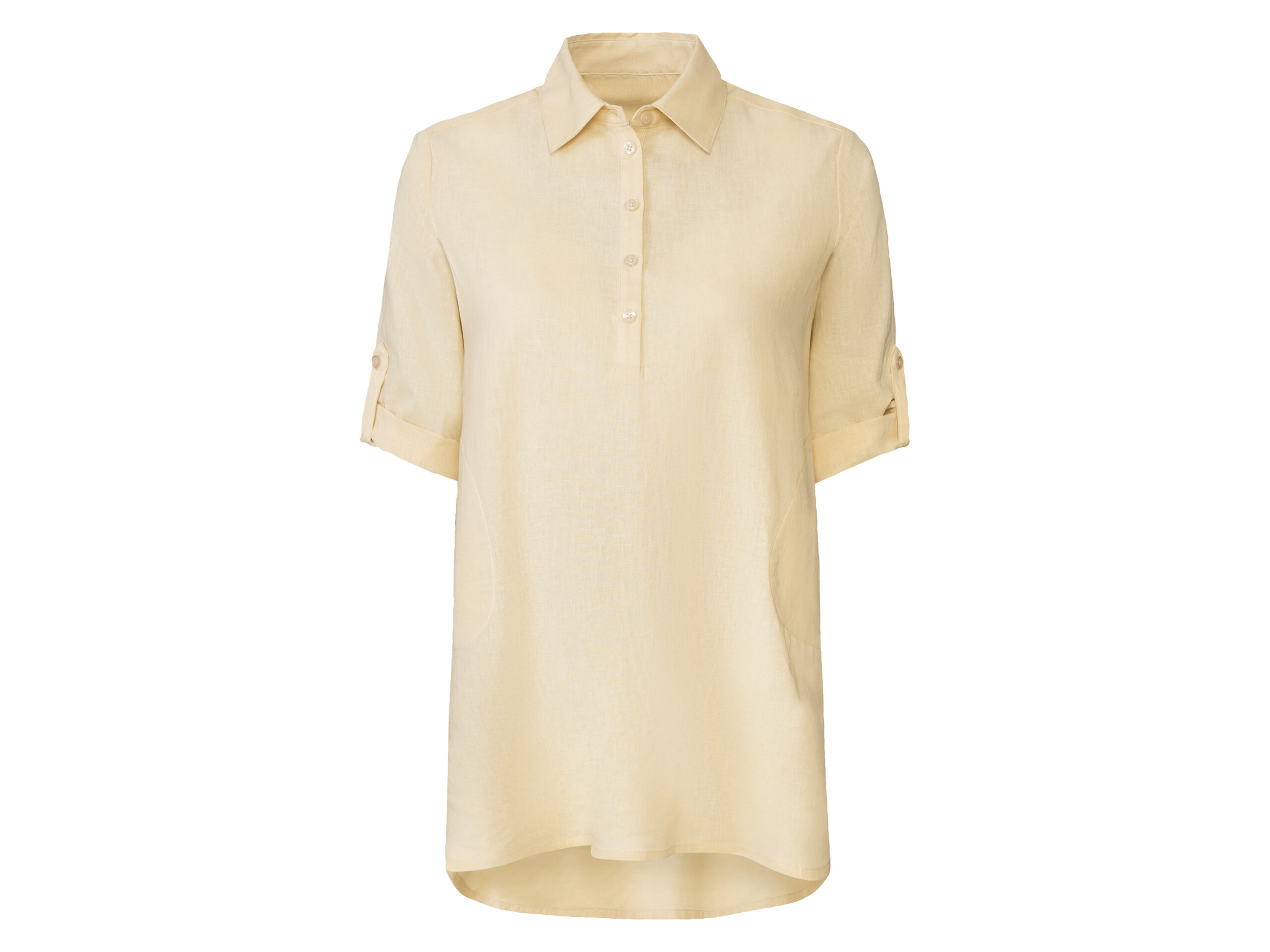 Wij ondersteunen de duurzame katoenteelt in Afrika Lichte en luchtige kwaliteit dankzij linnen en katoen Met Kentkraag en knoopsluiting Met modieuze halflange mouwen en oprolbare mouwen Met insteekzakken aan de zijkanten Met verlengde achterkant en afgeronde zoom Kleuren: beige, blauw Materiaal 55% linnen, 45% katoen Onderhoudsinstructies Wassen op max. 40 °C Niet bleken Niet in de wasdroger drogen Strijken tot 150 °C (stand 2). Stoomstrijkijzer kan gebruikt worden Niet chemisch reinigen Maten 34 – 46