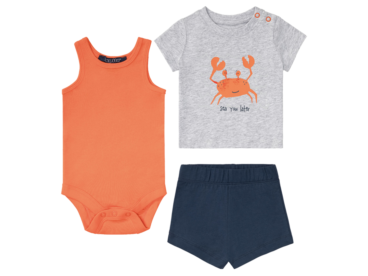 Set van body, shirt en short Natuurlijk draagcomfort door zuivere bio-katoen Body met drukknopen in het kruis voor gemakkelijk uittrekken Shirt met praktische schouderknoopsluiting Body en shirt met ronde hals Short met elastische tailleband 3-delig Verkijgbaar in 2 verschillende sets: Grijs/oranje/donkerblauw Wit/geel/donkerblauw Materiaal 100% katoen Onderhoudsinstructies Wassen op max. 60 °C Niet bleken Voorzichtig drogen in de wasdroger op max. 60°C Strijken tot 150 °C (stand 2). Stoomstrijkijzer kan gebruikt worden Niet chemisch reinigen Maten 50/56 – 86/92