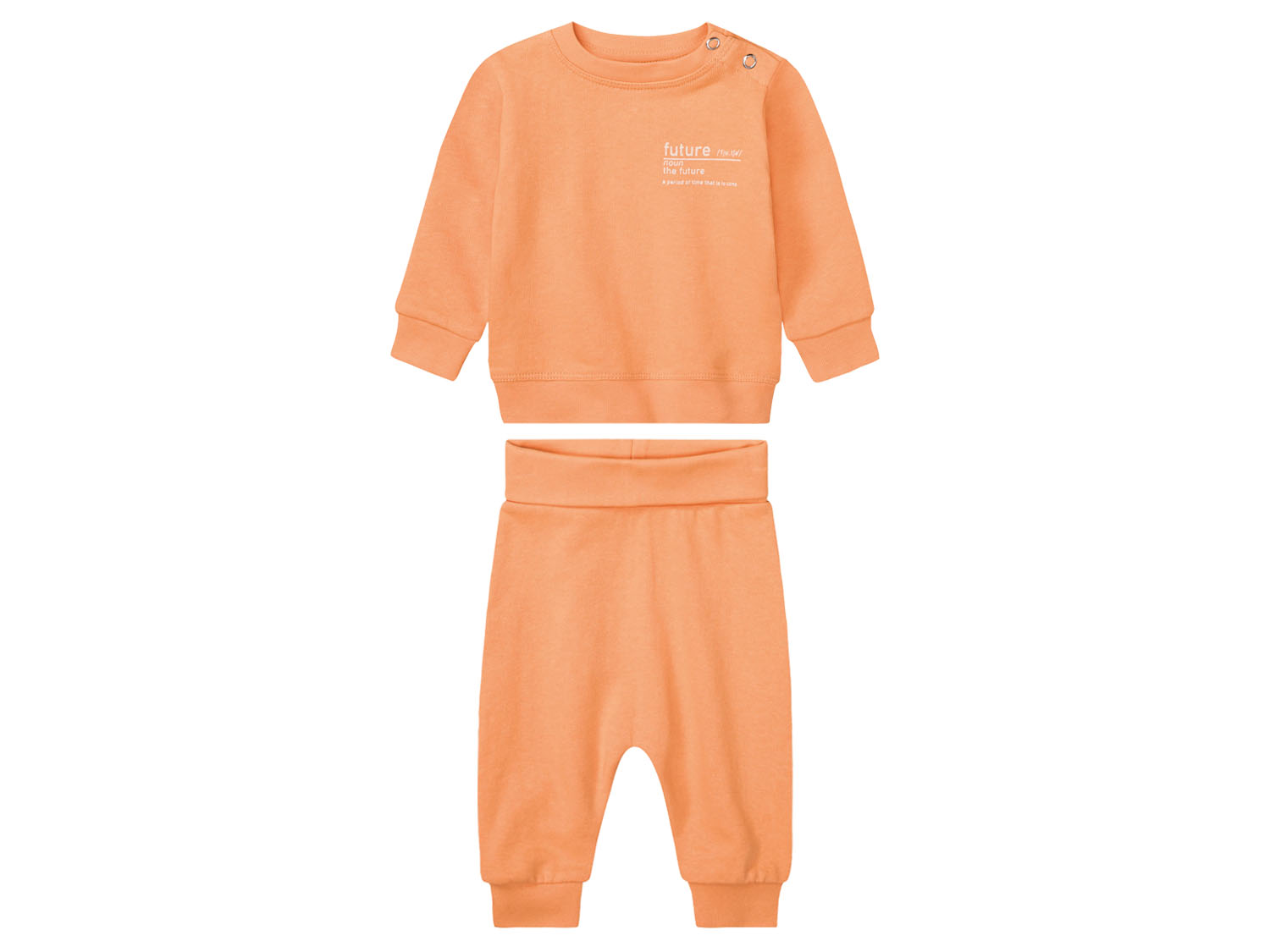 Milieuvriendelijke productie Geproduceerd onder veilige en sociaal aanvaardbare arbeidsomstandigheden Aangenaam draagcomfort door hoog katoengehalte Pullover met praktische schouderknoopsluiting en ronde hals Broek met comfortabele omslagband voor hoog draagcomfort Zachte French-Terry-kwaliteit Kleuren: blauw, lila, marine, oranje Materiaal 80 % katoen, 20 % polyester Onderhoudsinstructies Wassen op max. 40 °C (onderhoudsvriendelijk) Niet bleken Voorzichtig drogen in de wasdroger op max. 60°C Strijken tot 150 °C (stand 2). Stoomstrijkijzer kan gebruikt worden Niet chemisch reinigen Maten 50/56 – 86/92